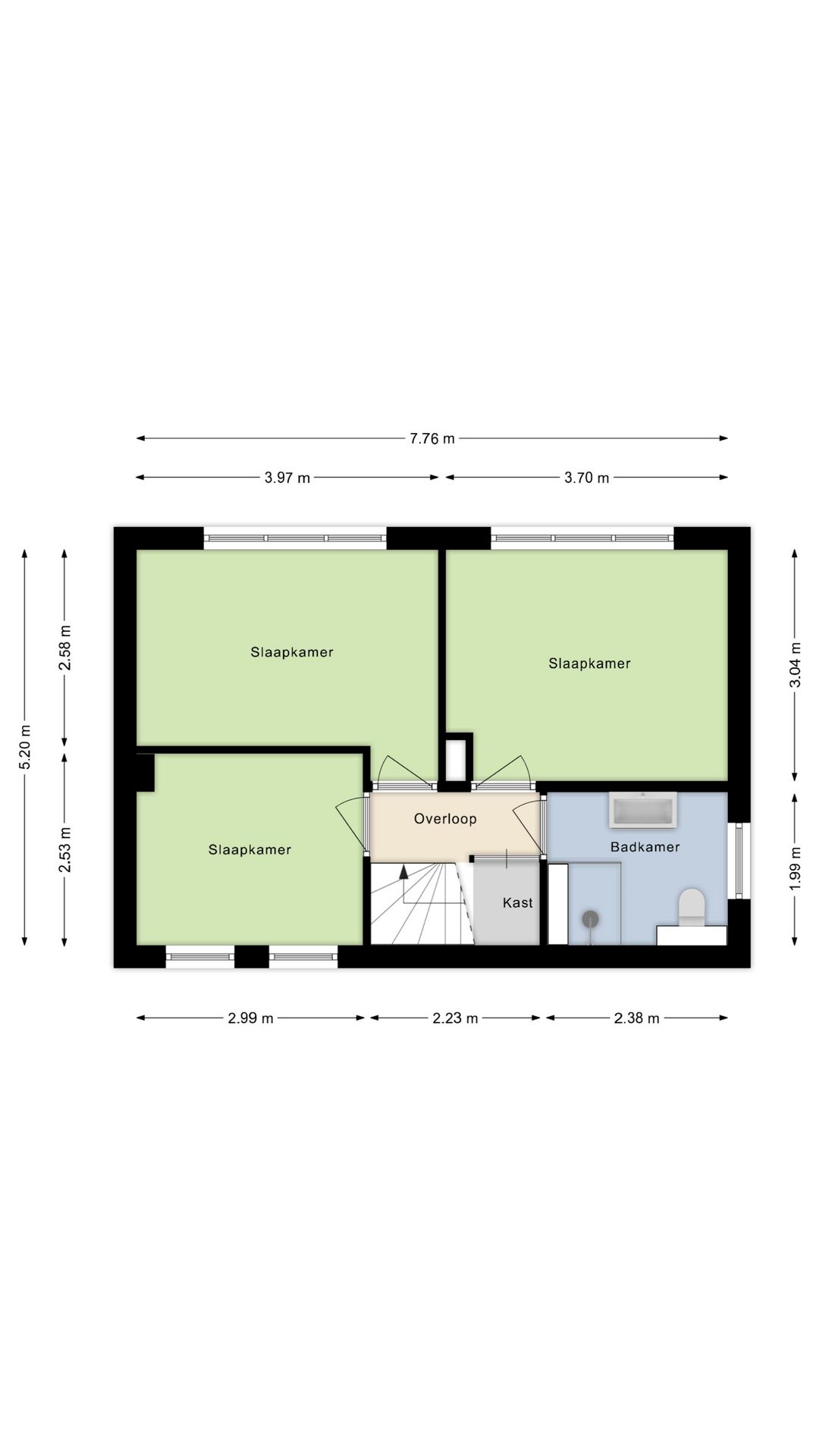 De eerste verdieping biedt een overloop met toegang tot drie ruime slaapkamers, allen voorzien van de mooie, originele houten vloerplanken. De eerste slaapkamer meet ca. 3,04 x 3,70, de tweede ca. 2,58 x 3,97, en de derde ca. 2,53 x 2,99m. Verder is er een praktische bergkast aanwezig. De deels vernieuwde badkamer is voorzien van een eigentijds tegelwerk (vloer en douche), een comfortabele inloopdouche, een toilet en een wastafel met meubel.