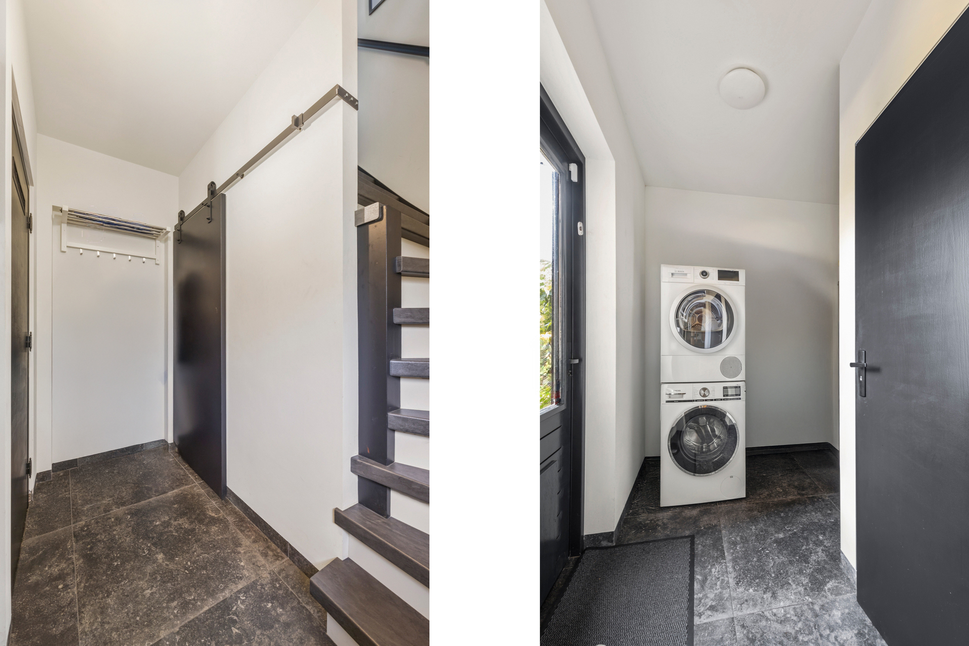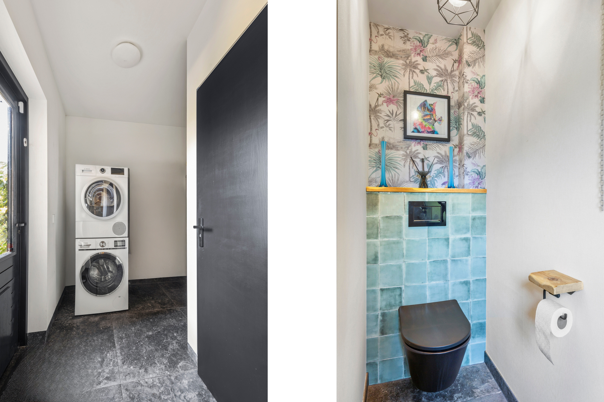Via een mooie ‘boeren schuifdeur’ kom je ook in de bijkeuken, waar je het toilet en de aansluitingen voor wasmachine en droger vindt. De bijkeuken verbindt de woning tevens met een inpandige berging (v.v. ruime bergzolder) én een geïsoleerde multifunctionele ruimte. Deze royale ruimte (22m²) is uitgerust met openslaande deuren, airconditioning en krachtstroom (400V). Perfect voor wie thuis werkt, klust, een extra hobbyruimte zoekt of een slaapkamer op de begane grond wenst.